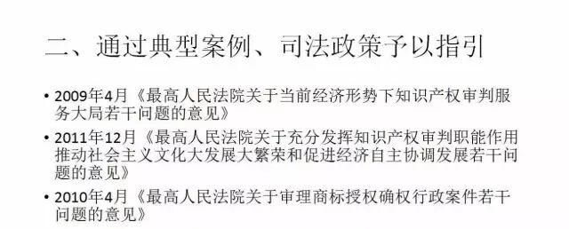 2017年1月,最高法院出台了《最高人民法院关于审理商标授权确权行政案件若干问题的规定》。通过制定司法解释进行统一规范。该司法解释第15条、第16条所涉及的代理人及其他关系的规定、对在先权利的保护、关于商标法第三十二条的“不正当手段”、关于商标法第四十四条第一款的“其他不正当手段”、第四十五条“恶意注册”的推定等具体条文,都做了规范,这体现了我们一贯的司法政策,也体现了我们之前的典型案例中的法律适用的总结。